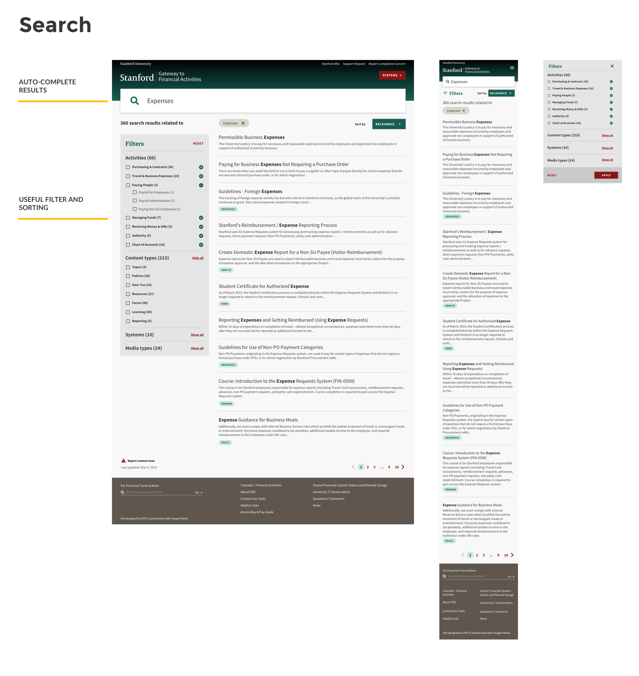 The new Homepage made sure to provide high-level structure to help users find info quickly and see the big picture of finance at Stanford. Search page provided an alternative approach to info finding.